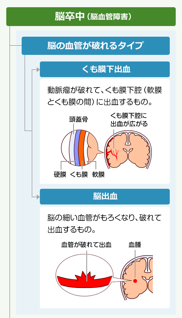 脳卒中は原因により、「脳の血管が詰まるタイプ(脳梗塞、一過性脳虚血発作)」と「脳の血管が破れるタイプ(脳出血、くも膜下出血)」の大きく2つに分けられます。
