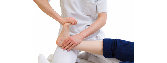 介助者は片手で足首を支え、もう一方の手でつま先を押して、指を伸ばします。
